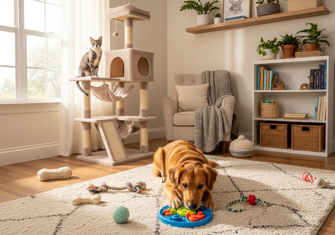 - 고양이: 수직 공간(캣타워, 캣폴)을 충분히 마련해주고, 숨을 수 있는 안전한 은신처(박스, 숨숨집)를 제공해주세요. 또한, 매일 일정한 시간에 사냥 놀이를 통해 수렵 본능을 충족시켜주는 것이 중요합니다.